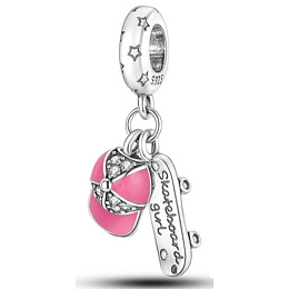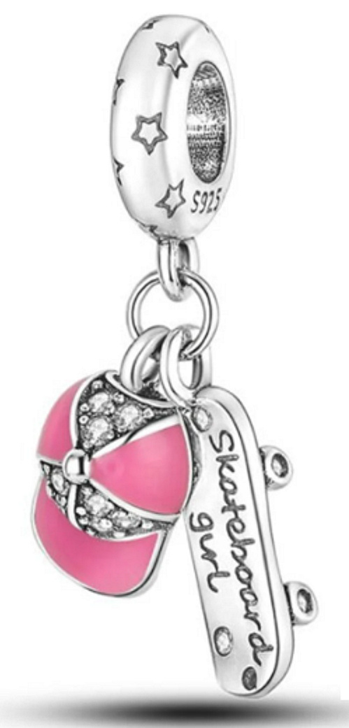 Visací přívěsek se skateboardem s vyrytým nápisem "skateboard girl" a baseballovou čepicí s hladkým růžovým smaltem a zářivě bílými drahokamy Zirkonu. Na prstenu přívěsku jsou kolem dokola malé hvězdičky. Přívěsek na náramek, nebo řetízek v designu skateboardu potěší každého skejtera. V růžovém dekoru bude tento korálek krásným doplňkem.