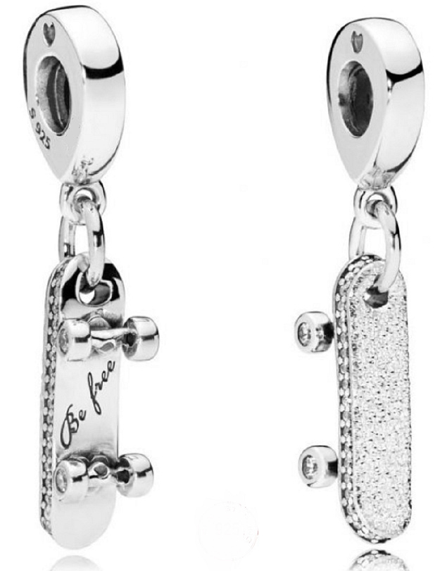 Tento roztomilý malý skateboardový přívěsek má texturovanou desku s čirými kubickými zirkoniemi osazenými kolem okraje a uprostřed koleček. Pod deskou je zábavná rytina „Be free“. Přívěsek je nového stylu, který je mírně podlouhlý a obsahuje mini srdíčko.