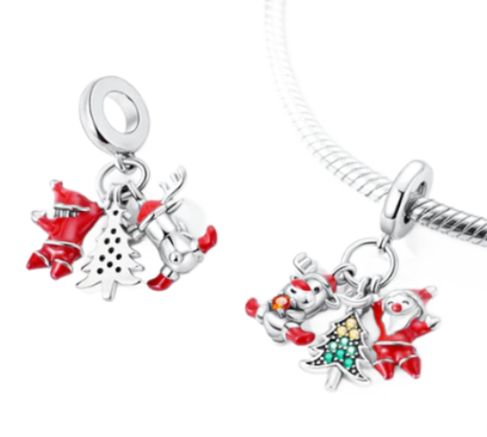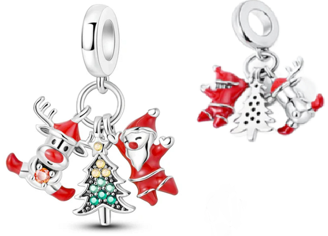 Visací přívěsek s vánočním stromkem se sobem a Santou, navržený s hladkým červeným smaltem a zelenými, žlutými a oranžovými třpytivými Zirkony. Roztomilý doplněk 3v1 je ideální do vaší vánoční sbírky.