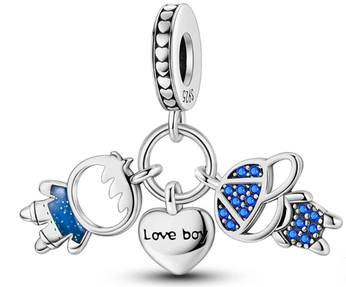 Trojitý přívěsek se dvěma malými chlapečky a přívěskem srdce, dekorován hladkým modrým smaltem a zářivě modrými drahokamy Zirkonu. Srdíčko má na přední straně vyrytá slova „love boy“ - miluju kluky. Na prstenu přívěsku jsou kolem dokola malá srdíčka. Darujte tento krásný přívěsek třeba mamince dvou malých kluků. S každým přívěskem vyprávěj svůj příběh a vytvoř si náramek, který odráží, kdo jsi. Tvůj styl. Tvůj náramek. Tvůj příběh.