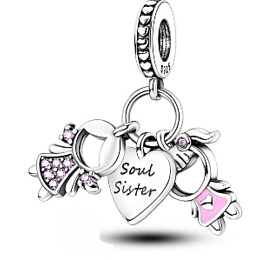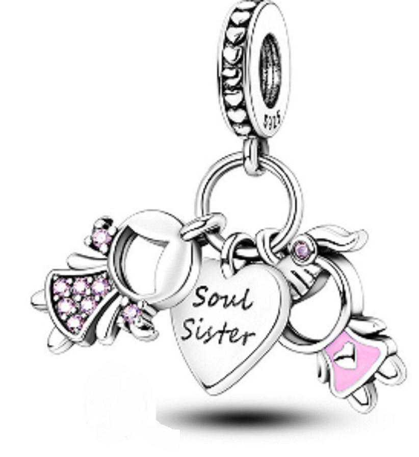 Trojitý přívěsek se dvěma malými holčičkami a přívěskem srdce, dekorován hladkým růžovým smaltem a zářivě růžovými drahokamy Zirkonu. Srdíčko má na přední straně vyrytá slova „soul sister“ - duše sestry a na zadní straně slovo „forever“ - navěky s malým červeným smaltovaným srdíčkem. Na prstenu přívěsku jsou kolem dokola malá srdíčka. S každým přívěskem vyprávěj svůj příběh a vytvoř si náramek, který odráží, kdo jsi. Tvůj styl. Tvůj náramek. Tvůj příběh.