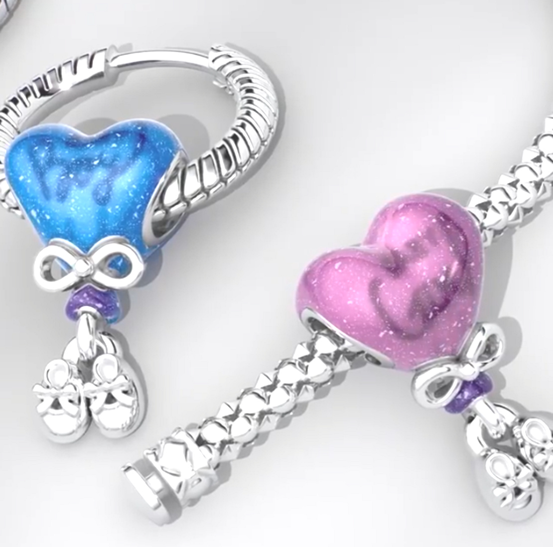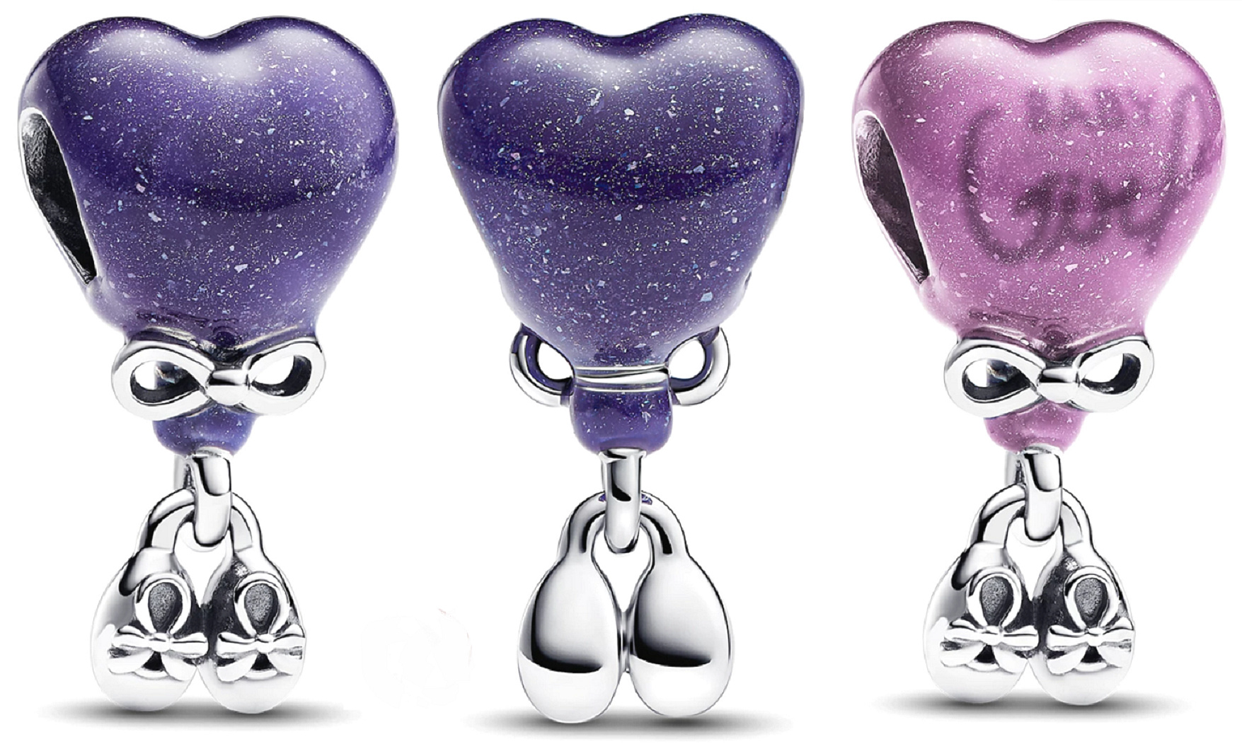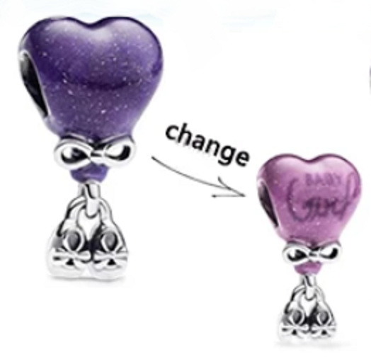 Korálek balón s dětskými botičkami, korálek je pokryt glazurou, která při vyšší teplotě (cca od 36 ºC – 40 ºC) změní barvu z fialové na růžovou a odkryje nápis „Baby Girl“ (holčička).