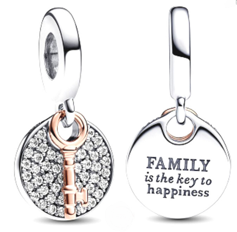 Odemkněte radost pomocí dvoubarevného přívěsku. Tento dvoudílný přívěsek má kulatý kotouč zdobený třpytivými detaily. S vyrytým nápisem „RODINA je klíčem ke štěstí“ na leštěné straně se otočí a odhalí texturovanou, světlo odrážející pavézu. Klíč se volně houpe a symbolizuje nerozbitné rodinné pouto. Nechť tento srdečný kousek slouží jako připomínka toho, že opravdové štěstí se nachází ve společnosti milovaných.