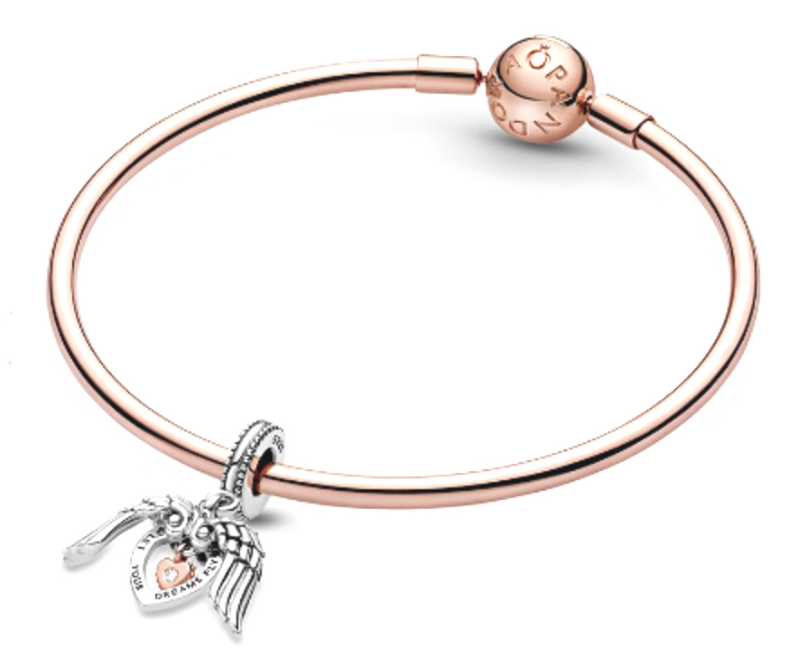 Přívěsek ručně dokončen ze sterlingového stříbra a jemně pozlacen 14k růžovým zlatem, obsahuje laboratorně vytvořený diamant. Stříbrná pohyblivá andělská křídla tvoří otevřený tvar srdce, který rámuje otevřený disk ve tvaru srdce s rytinou „Nechte své sny létat“. Uprostřed se nachází malé houpající se srdce pozlacené 14k růžovým zlatem zdobené laboratorně vytvořeným diamantem. Nechte se inspirovat k dalšímu snění s tímto speciálním designem.