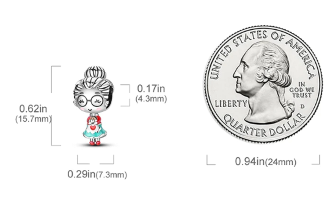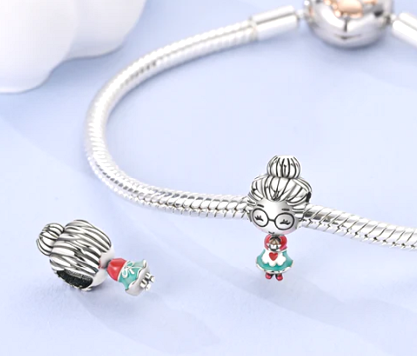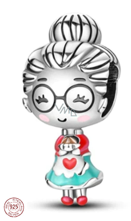 Přívěsek s babičkou držící koláč, navržený s hladkým červeným, modrým a hnědým smaltem. Babička je výjimečná žena, která je pro svá vnoučátka symbolem moudrosti, klidu, pohody a obrovským zdrojem lásky. A i když není se svými vnoučátky stále spolu, bude pro ně vždy přístavem, kde se jim dostane pochopení a pohlazení.