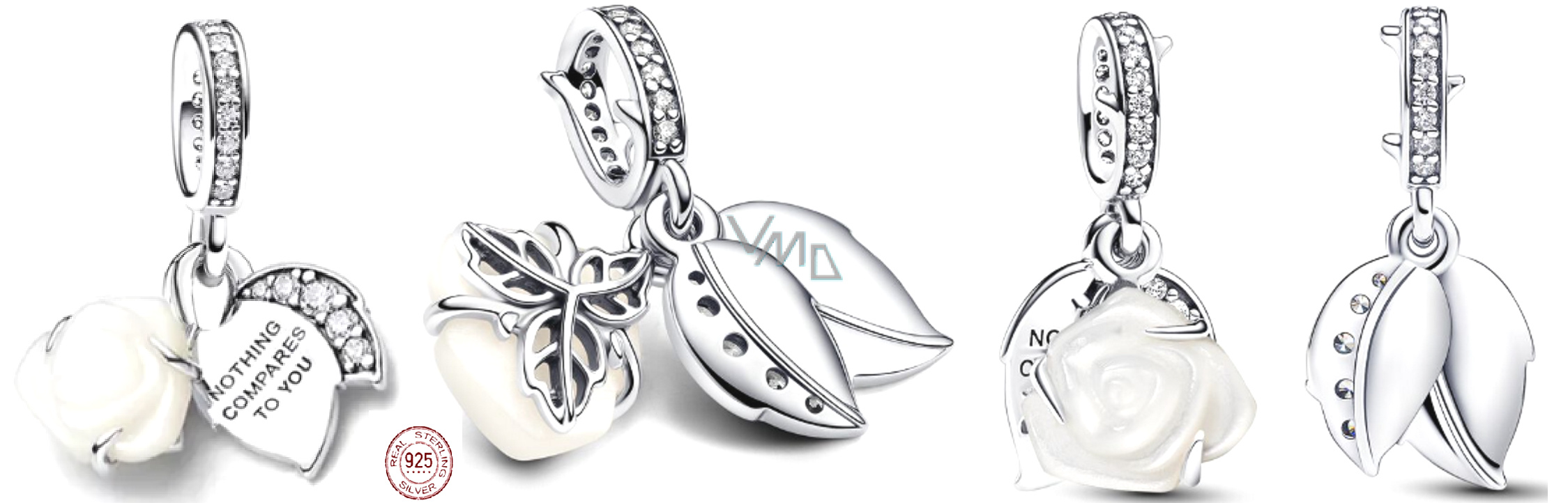 Charm Sterlingové stříbro 925 Bílá růže v květu 2v1, přívěsek na náramek láska, květina