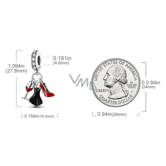 Symboly ženskosti - sklenici červeného vína, černé šaty a špendlík. Visací přívěsek 925 Sterling Silver s červenou botou na podpatku, roztomilými černými šaty a sklenkou červeného vína s hladkým černým a červeným smaltem a bílými třpytivými drahokamy Zirkonu. Čas na dívčí večer! S každým kouzlem vyprávějte svůj příběh a vytvořte náramek, který odráží, kdo jste a co je pro vás důležité. Tvůj styl. Váš náramek. Tvůj příběh.