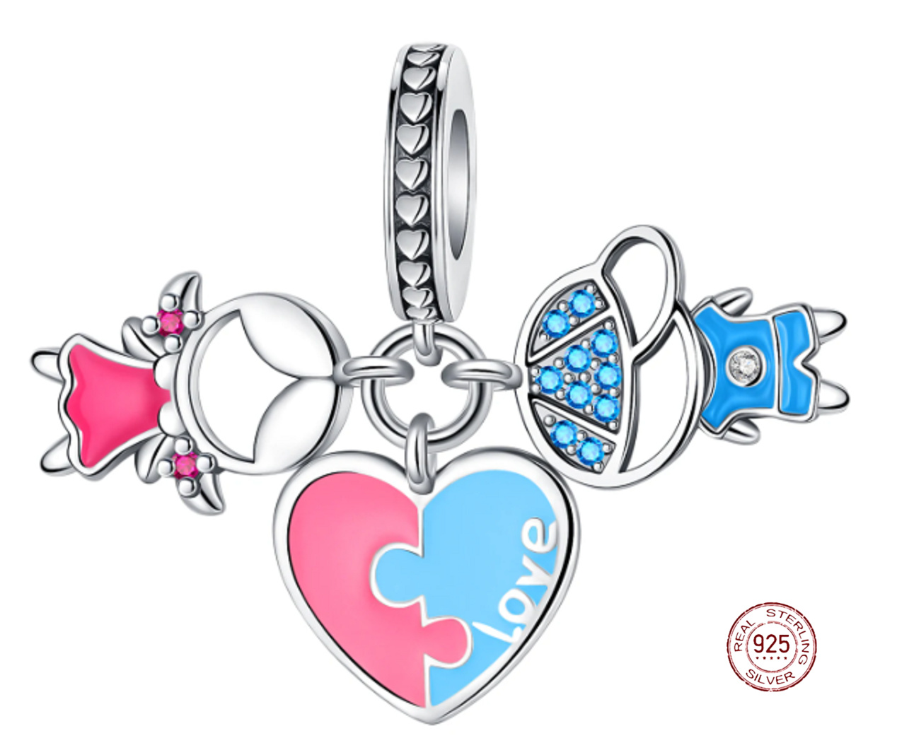 Charm Sterlingové stříbro 925 Chlapec a dívka milostný pár 3v1, přívěsek na náramek láska