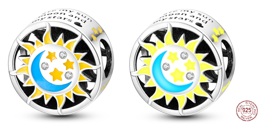 Přívěsek zářící v temnu s designem se sluncem, Měsícem a hvězdami navrženými s hladkým modrým a žlutým smaltem a bílými třpytivými drahokamy Zirkonu. Po stranách korálku jsou vyryta slova „jsi moje slunce, můj měsíc a všechny moje Hvězdy“.