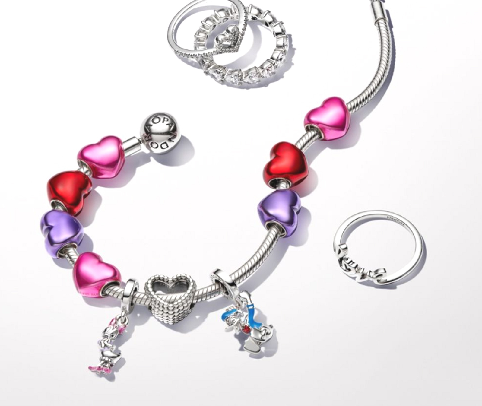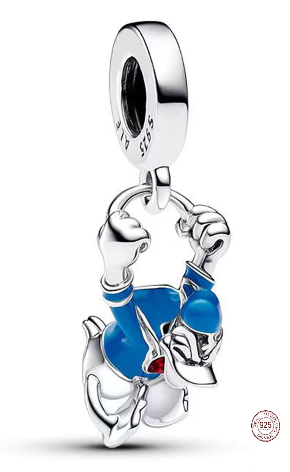 Tento design ze sterlingového stříbra představuje postavu kačera Donalda Disneyho ve středním skoku se zvednutými pažemi, zavřenýma očima a otevřeným zobcem. Jeho námořní košile a klobouk mají modré a červené smaltované detaily. Kačer Donald, známý svou ohnivou povahou, silnými názory a zlomyslností, je ikonickou postavou ve vesmíru Disney, díky čemuž je tento přívěsek dokonalým doplňkem sbírky každého fanouška.