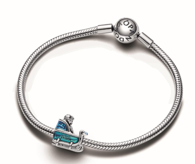 Kdo by neznal krásnou pohádku Frozen, Ledové království, od Disney. Hlavní hrdinka Anna se vydává na velkolepou výpravu aby nalezla svou sestru Elsu, jejíž ledová kouzla uvěznila království Arendelle do věčné zimy. Podívejte se na korálek sání s Annou a Elsou sedícími uvnitř s detaily krásného modrého smaltu, který je v té přesné paletě Frozen. Na okraji saní na jedné straně je nápis World of Frozen a na druhé nápis Disney.