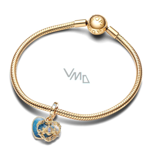 Tento jemně pozlacený přívěsek 14karátovým zlatem, inspirovaný Popelčiným milovaným příběhem, obsahuje dva disky ve tvaru srdce. Jeden představuje Popelčin kouzelný kočár ve složitém prolamovaném díle s modrým kamenem ve tvaru markýzy uprostřed. Za ním se nachází druhý kotouč ve tvaru srdce s třpytivě modrým smaltem a na zadní straně je vyrytý vzkaz „Sen je přání tvého srdce“. Noste jej na svém oblíbeném náhrdelníku, náramku nebo přívěsku jako připomínku síly následování svých snů.