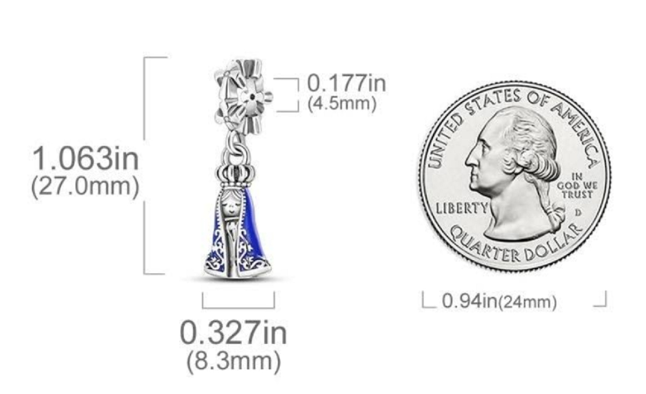 Visací přívěsek Blahoslavené panny Marie Nossa Senhora Aparecida z ryzího stříbra 925, nosený pro duchovní vedení a ochranu. Navrženo s bílými třpytivými drahokamy Zirkonu a hladkým modrým smaltem - smaltovaným županem a korálkovou korunou.