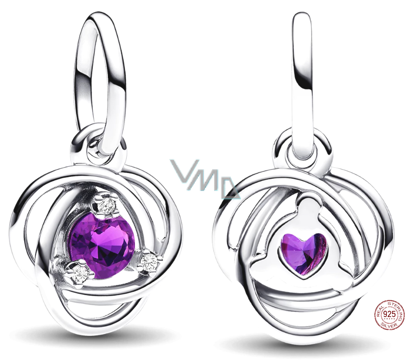 Stříbrný přívěsek s fialovým křišťálem a třemi malými Zirkony čiré barvy. Propletené kruhy symbolizují věčnost. Na zadní straně je detail srdíčka, přes který můžete vidět osazený kámen k měsíci narození - ÚNOR.