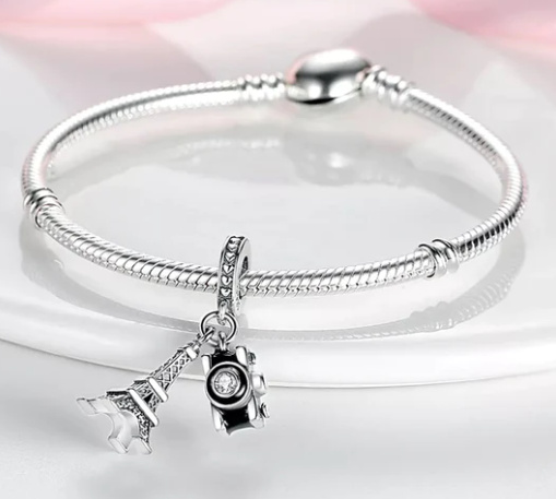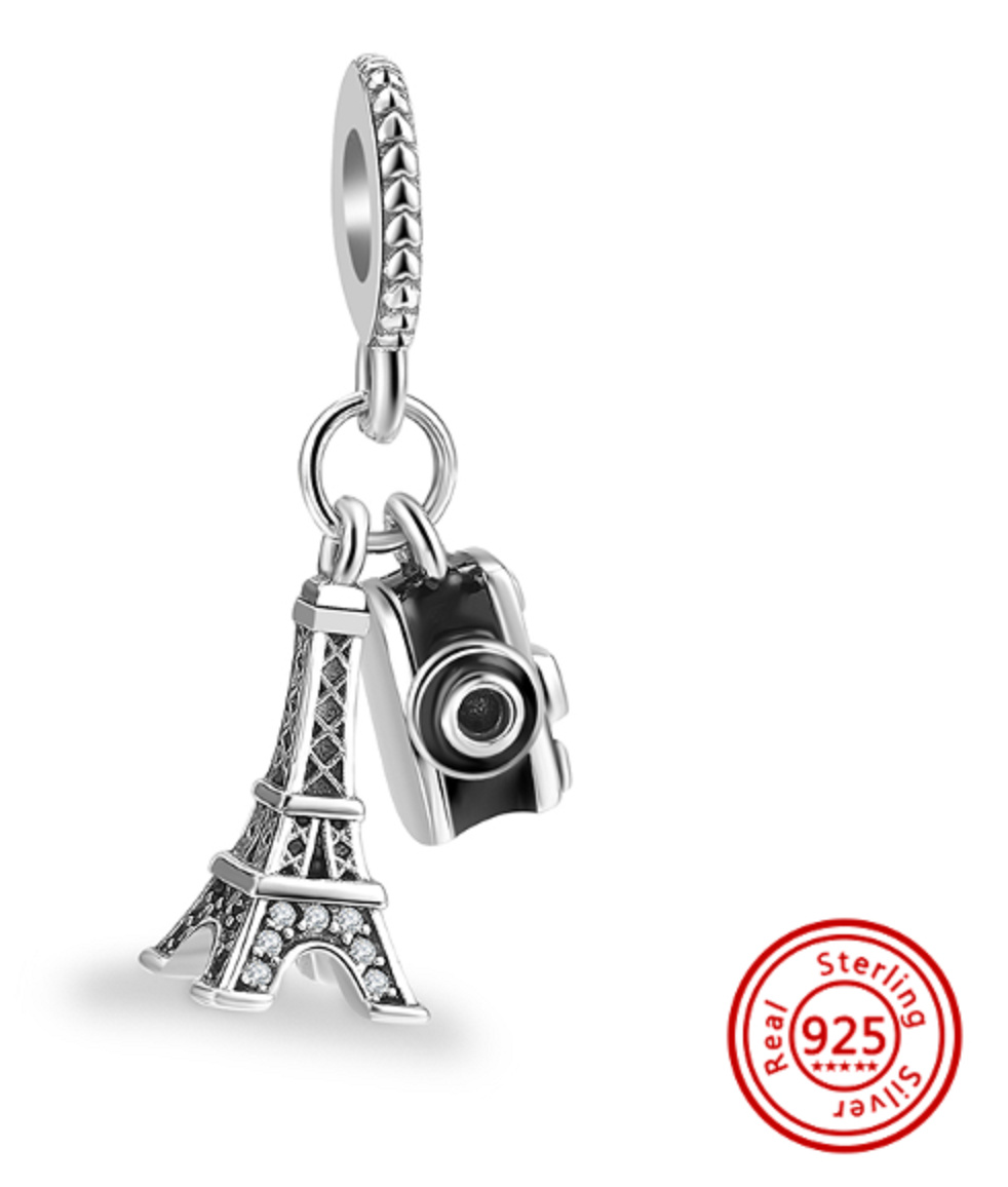 Charm Sterlingové stříbro 925 Francie, Paříž - Eiffelova věž + fotoaparát, pozdrav z Francie, 2v1 přívěsek na náramek cestování
