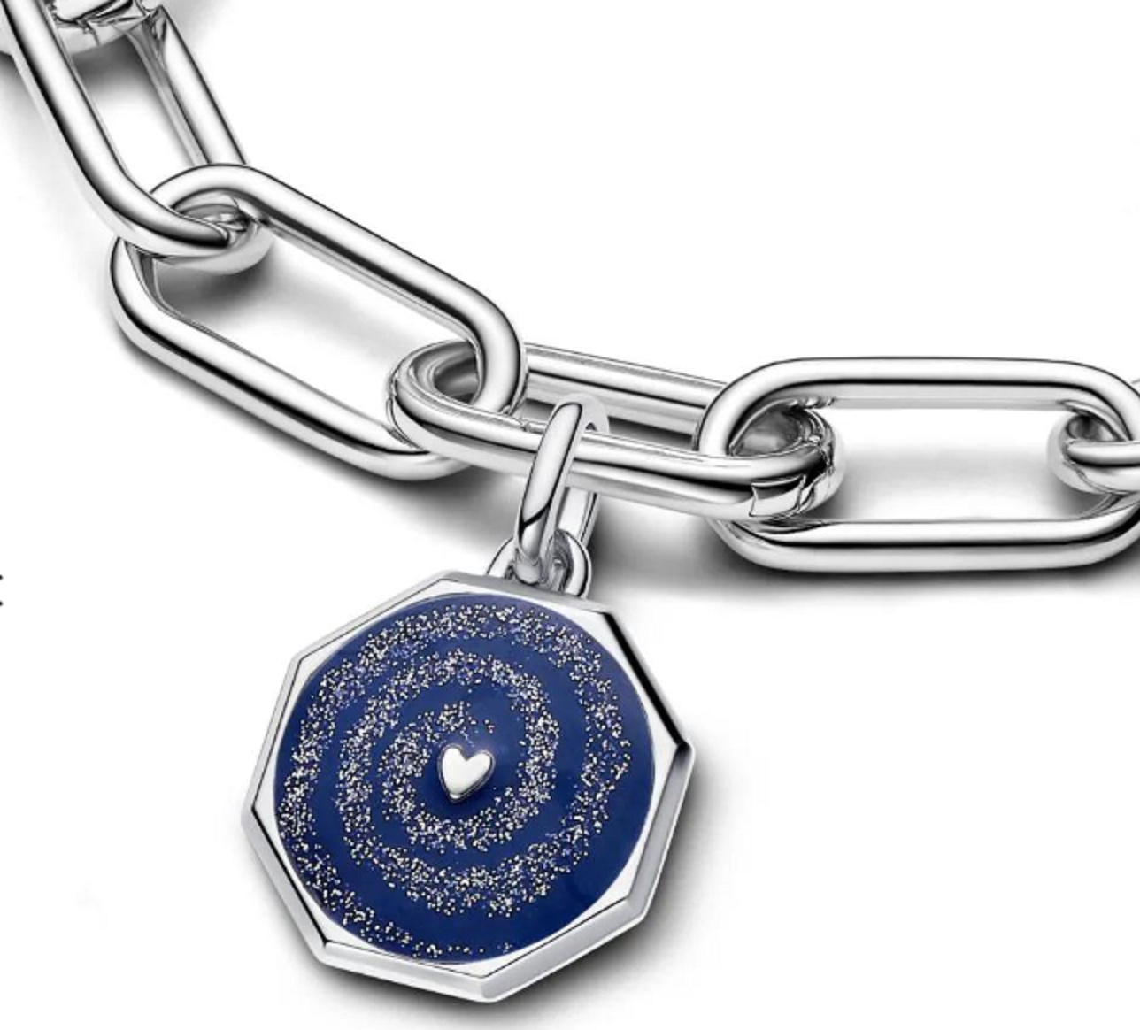 Pociťte vesmírnou lásku s mini přívěskem. Jedna strana tohoto osmihranného medailonového přívěsku z mincovního stříbra má vyvýšené srdce obklopené třpytivým tmavě modrým ručně aplikovaným smaltem. Na zadní straně je vyvýšené srdce obklopené vyříznutými paprsky s mikroperličkami. Tento medailonový přívěsek, navržený tak, aby byl stylizovaný na otevíratelné články, noste jako připomínku toho, že láska vždy vítězí a je srdcem našeho tajemného vesmíru. Kompatibilní s Pandora ME a Pandora Moments
