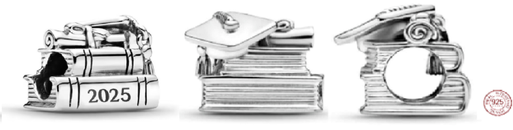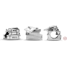 Krásný korálek ze sterlingového stříbra 925 ve tvaru knihy, promoční čepice a svitku který má na sobě vyrytý rok 2025. Věnujte krásnou upomínku čerstvému absolventovi střední či vysoké školy.