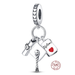 Charm Sterlingové stříbro 925 Graduation - čepice, diplom pergamen, 3v1 Absolvent přívěsek na náramek, gradace