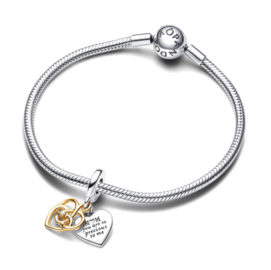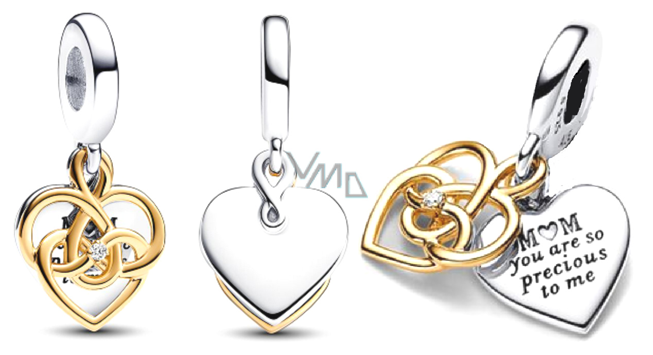 Síla mateřské lásky jasně září v gravírovatelném přívěšku maminky. Přívěsek je s motivem srdce jemně pozlaceným 14karátovým zlatem na disku ve tvaru srdce propleteným s prolamovaným srdcem inspirovaným uzlem ztělesňuje nekonečnou lásku k mámě. Uprostřed svítí laboratorně vypěstovaný zirkon, který symbolizuje její vzácnost. druhý disk vyrobený ze sterlingového stříbra nese srdečnou rytinu s nápisem „Mami, jsi mi tak vzácná“, zatímco jeho zadní strana je gravírovatelná pro osobní dotek.