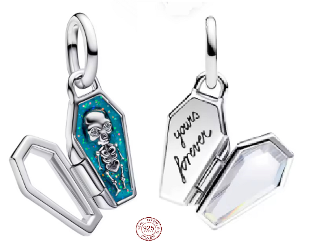 Objev kouzlo temnoty a mystiky s tímto originálním přívěskem ve tvaru rakve. Přívěsek je vyroben z pravého stříbra 925/1000 a skrývá detailně propracovanou kostru na třpytivém podkladu v modrozelených odstínech. Na zadní straně je vyryto “Yours Forever” (Navždy tvůj), což dodává šperku romanticko-mystický nádech. Ideální doplněk nejen na Halloween, ale i jako symbol věčné lásky, tajemství a odvážného stylu.