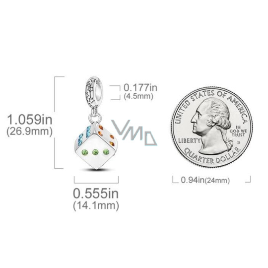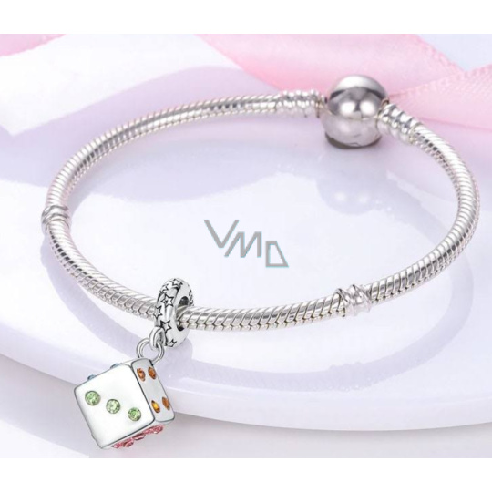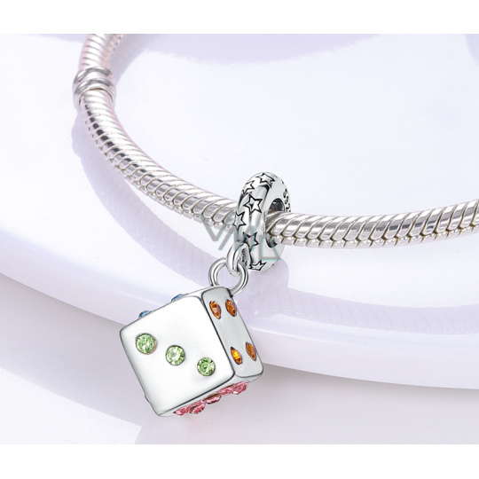 Stylový přívěsek ve tvaru Hrací kostky ze sterlingového stříbra 925, doplněn barevnými kamínky, je nejen krásným doplňkem, ale i silným symbolem odvahy, svobody volby a rozhodnutí. Jemné a detailní zpracování dodává šperku elegantní vzhled, který vynikne na každém náramku nebo řetízku. Je kompatibilní s většinou náramků známých značek.