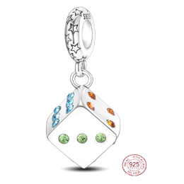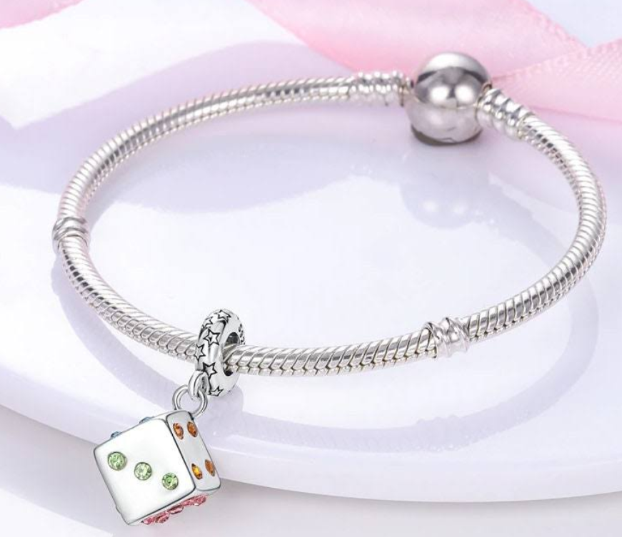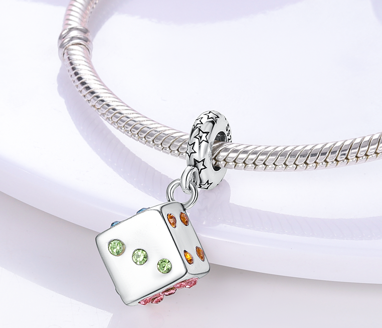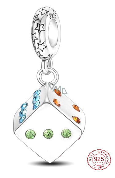 Stylový přívěsek ve tvaru Hrací kostky ze sterlingového stříbra 925, doplněn barevnými kamínky, je nejen krásným doplňkem, ale i silným symbolem odvahy, svobody volby a rozhodnutí. Jemné a detailní zpracování dodává šperku elegantní vzhled, který vynikne na každém náramku nebo řetízku. Je kompatibilní s většinou náramků známých značek.