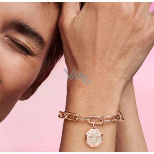 Všechny oči budou upřeny na vás, když budete nosit Medailonový přívěsek Jiskřivé oči. Tento medailonový přívěsek jemně pozlacený 14karátovým růžovým zlatem má tvar osmiúhelníku s vyrytým nápisem „S jiskřivýma očima jako Hvězdy na nebi. Na jedné straně jsou tvary oka a Hvězdy ručně osazeny kamínky, které se třpytí ze základu z třpytivého bílého smaltu. Detailní a jemné, toto oduševnělé kouzlo vám dá Hvězdy do očí.