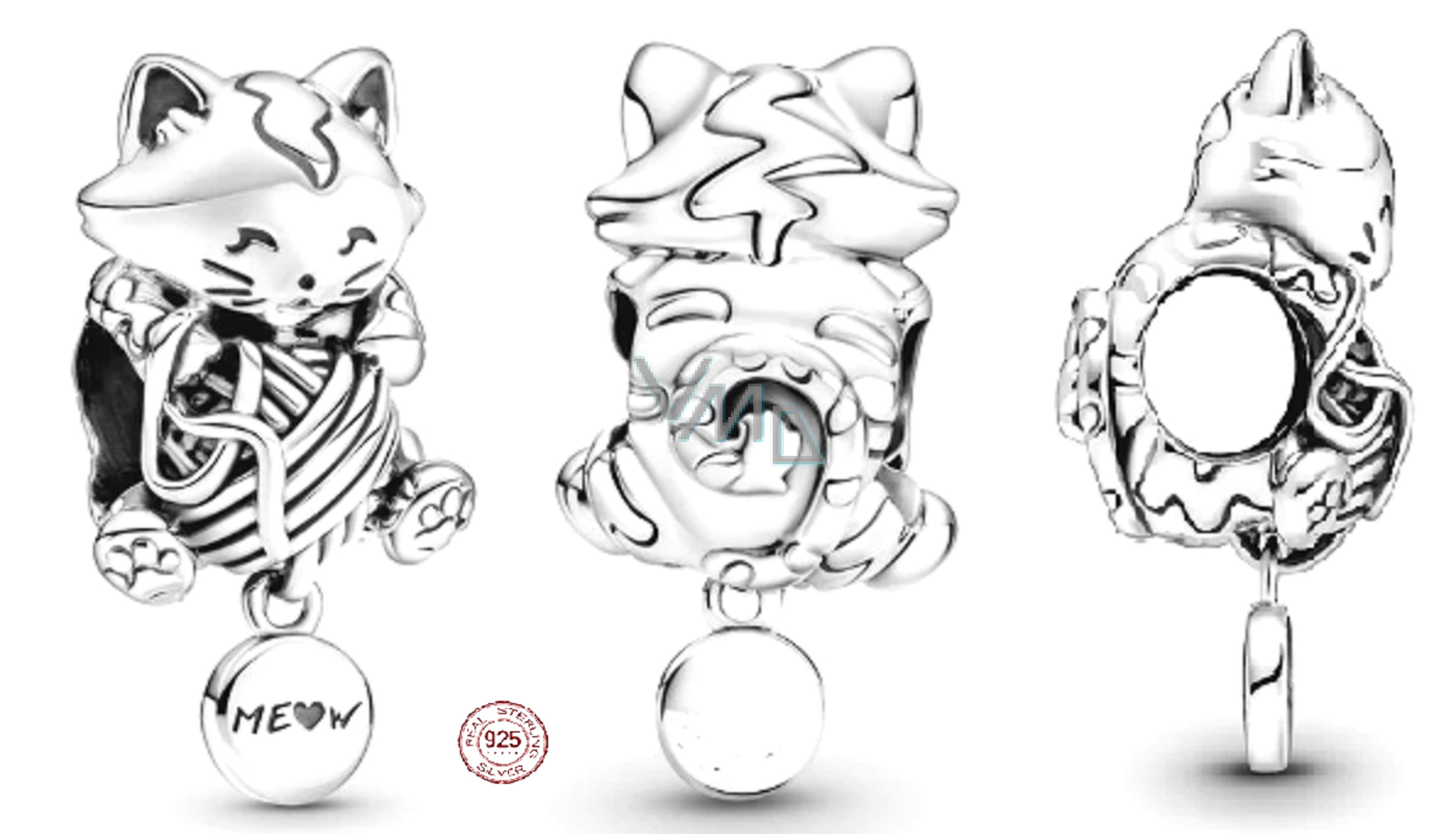 Charm Sterlingové stříbro 925 Kotě s klubíčkam, korálek na náramek mazlíček
