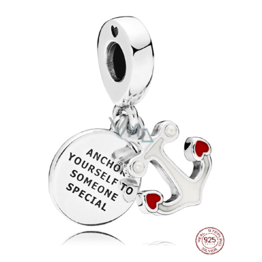 Pěkný přívěsek s námořnickým dojmem má disk se zprávou „Ukotvěte se k někomu výjimečnému“ a mini kotvu se dvěma červenými smaltovanými srdíčky.