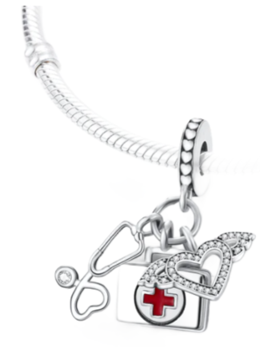 Charm Sterlingové stříbro 925 Lékař 3v1 stetoskop, lékárnička a přívěsek na náramek ve tvaru srdce s křídly zaměstnání