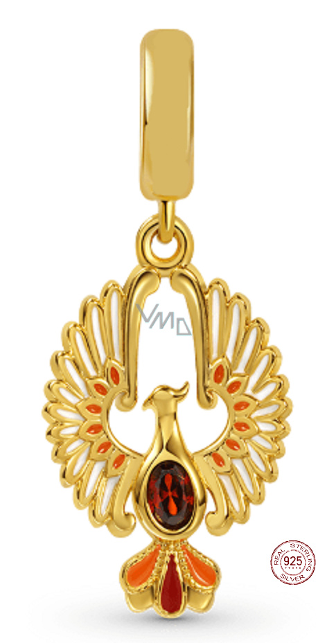 Pozlacený létající fénix ze sterlingového stříbra, doplněn sklíčkem ve středu a smaltovými prvky, může ukázat svou noblesu.