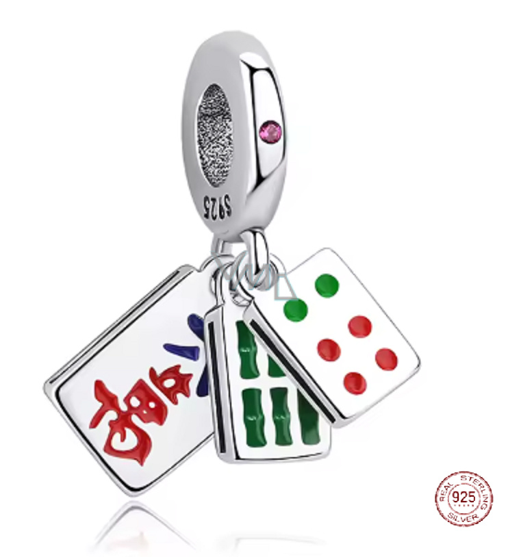 Charm Sterlingové stříbro 925 Mahjong – Tři kameny štěstí, herní talisman z Východu, přívěsek na náramek cestování
