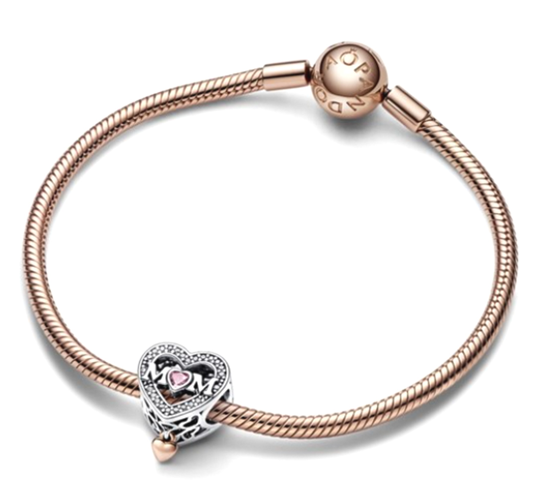 Přívěsek Matka s visícím srdcem oslavuje všechny výjimečné matky v našich životech. Toto prolamované srdíčko vyrobené ze sterlingového stříbra má na jedné straně růžový kabošonový kámen ve tvaru srdce, s vyrytým srdcem na zadní straně viditelným skrz kámen. Na druhé straně přívěsku se objevuje slovo „M♥M“ v ryzosti 925 Sterling Silver s růžovým kamenem ve tvaru srdce tvořícím písmeno „o“. Každá strana přívěsku je zdobena pavé bezbarvými krychlovými Zirkony a motivem srdce broušeným po okrajích. Na spodní části přívěsku visí malé srdce z jedinečné slitiny kovu pozlacené 14karátovým růžovým zlatem. Dárek plný významu, který ukáže vaši lásku osobě, která vždy byla po vašem boku.