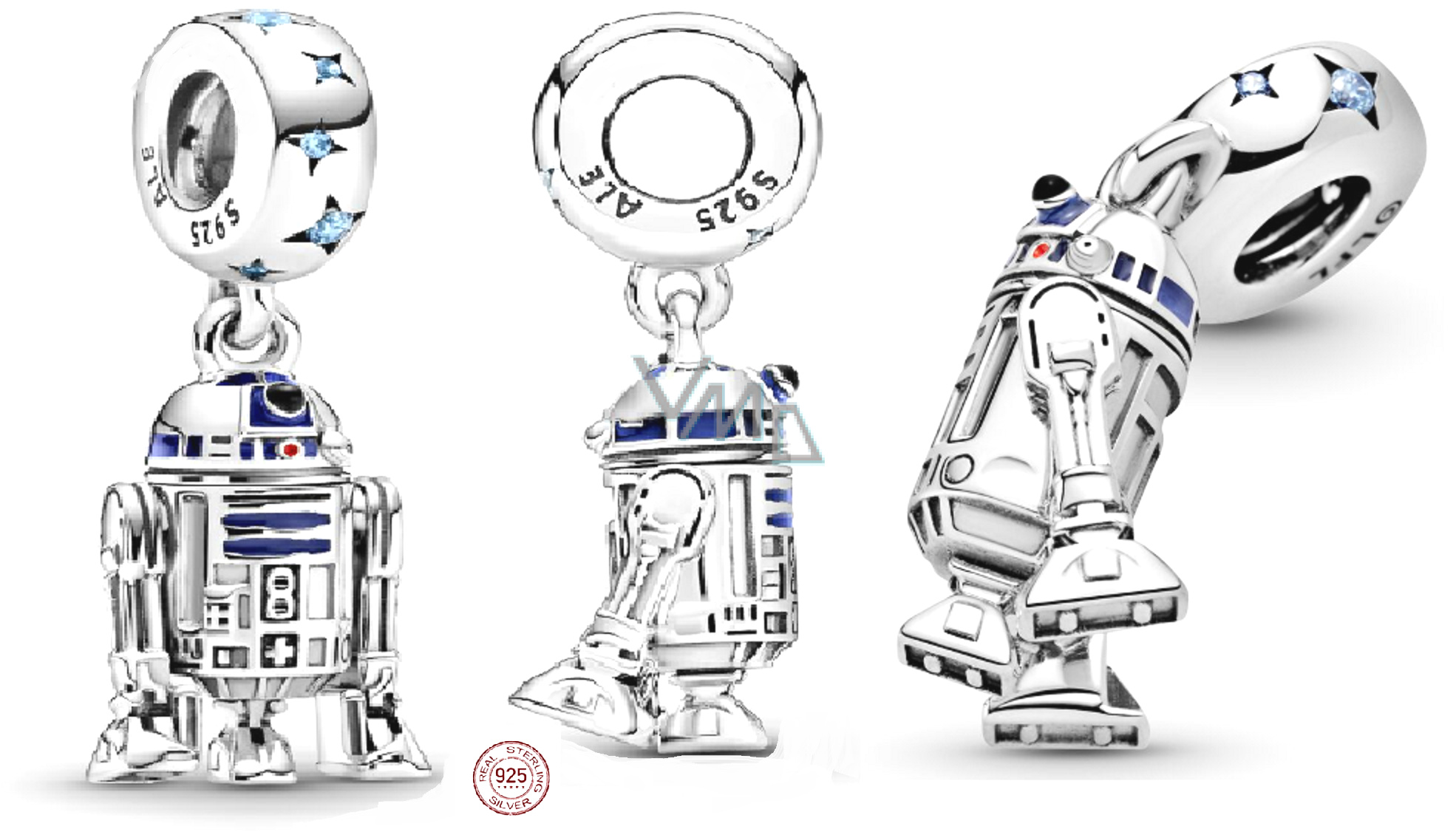 Originální přívěsek jednoho z nejznámnějších robotů, R2-D2, z vesmírného fenoménu Star Wars. Obdarujte člověka, který je dobrodružný, vynalézavý a loajální stejně jako tento roztomilý malý robot. Vyrobený ze sterlingového stříbra 925 s umělými kameny. Vlastní 9 hvězd i s pastelově modrými Zirkony a tmavě modrým, červeným a černým smaltem. Celé tělo přívěsku je pokryto mechanickými řezbářskými detaily, HLAVA se může otáčet o 45 stupňů a paže se mohou otáčet o 180 stupňů. Chodidla mají mřížkovou texturu.