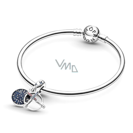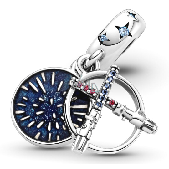 Staňte se neporazitelným s dvojitým světelným mečem Dangle Charm z kolekce Star Wars. Design je inspirován úvodní scénou ságy Star Wars, která ukazuje galaxii plnou hvězd. Přední disk je ručně vyrobený ze stříbra 925 a obsahuje dva zkřížené světelné meče. Jeden je zdobený červenými kameny a druhý modrými kameny. Zadní disk zdobí ručně aplikovaný třpytivý modrý smalt, nesčetné množství hvězd a rytina „May the Force be with you“ - "Nechť tě provází síla" na zadní straně.
