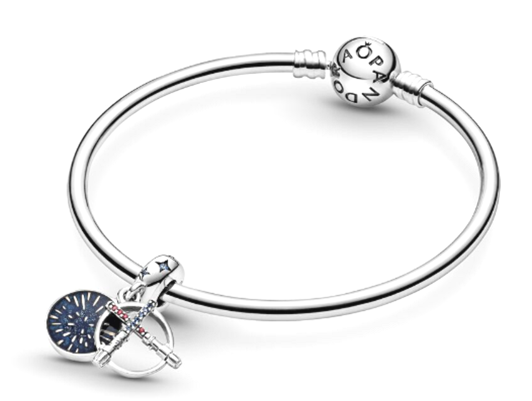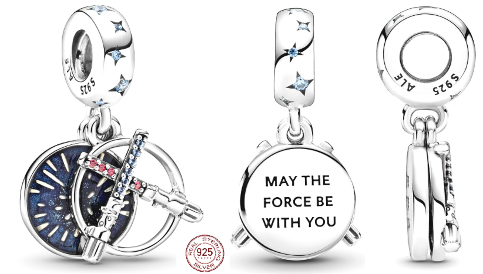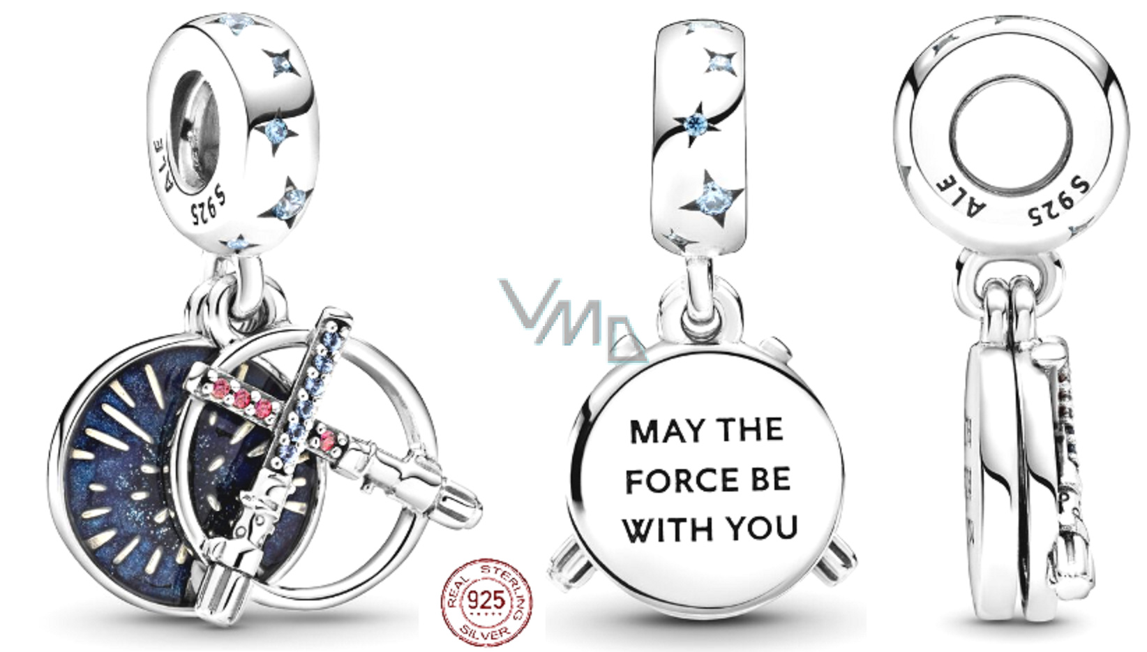 Staňte se neporazitelným s dvojitým světelným mečem Dangle Charm z kolekce Star Wars. Design je inspirován úvodní scénou ságy Star Wars, která ukazuje galaxii plnou hvězd. Přední disk je ručně vyrobený ze stříbra 925 a obsahuje dva zkřížené světelné meče. Jeden je zdobený červenými kameny a druhý modrými kameny. Zadní disk zdobí ručně aplikovaný třpytivý modrý smalt, nesčetné množství hvězd a rytina „May the Force be with you“ - "Nechť tě provází síla" na zadní straně.