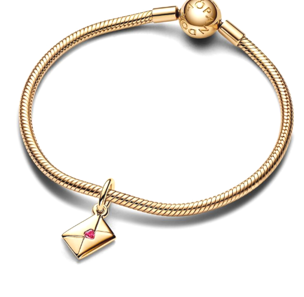 Moje lásko... Pošlete dopis tomu, koho milujete, pomocí přívěsku. Toto jemně pozlacené kouzlo 14karátovým zlatem, inspirované ručně psaným milostným dopisem, má tvar obálky visící na úhlu s realistickými detaily. Pečeť na obálce představuje červený kámen kubické zirkonie ve tvaru srdce. Otočte kouzlo a najděte vyrytý vzkaz "To my Love xoxo" s výřezem ve tvaru srdce odhalujícím červený kámen místo písmene "o" v "Love." Darujte to tomu, kdo má vaše srdce, jako nostalgické gesto lásky.