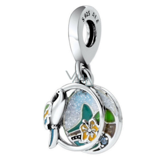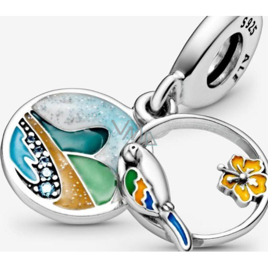 Přiveďte zpět vzpomínky na Brazílii s tímto barevným visícím kouzlem! Přední disk se skládá ze dvou prvků a představuje papouška s jasným peřím a žlutým smaltovaným květem ibišku. Za třpytivou plážovou scénou je vyobrazena modrá a zelená smalty a bleděmodré kameny. Na zadní straně přívěsku je vyrytý nápis „Love Brazil“.