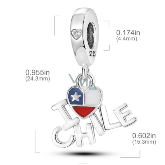 Charm Sterlingové stříbro 925 Chilská vlajka srdce - Miluji Chille - I Love Chile, 2v1 přívěsek na náramek cestování