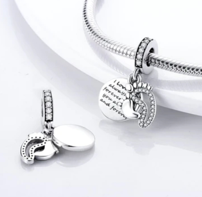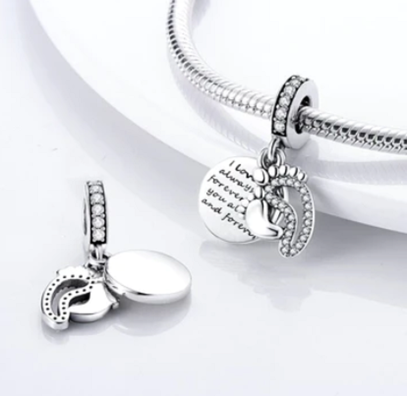 Charm Sterlingové stříbro 925 Miluji tě vždy a navždy - otisky nohou, 2v1 přívěsek na náramek rodina