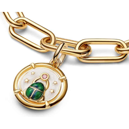 Resetujte svoje podvědomí pomocí tohoto smysluplného medailonového kouzla s motivem brouka Skarabea. Přívěsek je jemně pozlacený 14karátovým zlatem a obsahuje motiv brouka Skarabea s třpytivým zelenobílým smaltem - symbol růstu a transformace a růžovým krystalem z kubické zirkonie. Na zadní straně je vyrytý vzkaz „NEW Mindset NEW Focus NEW Beginning“ - „NOVÉ myšlení, NOVÉ zaměření, NOVÝ začátek“.