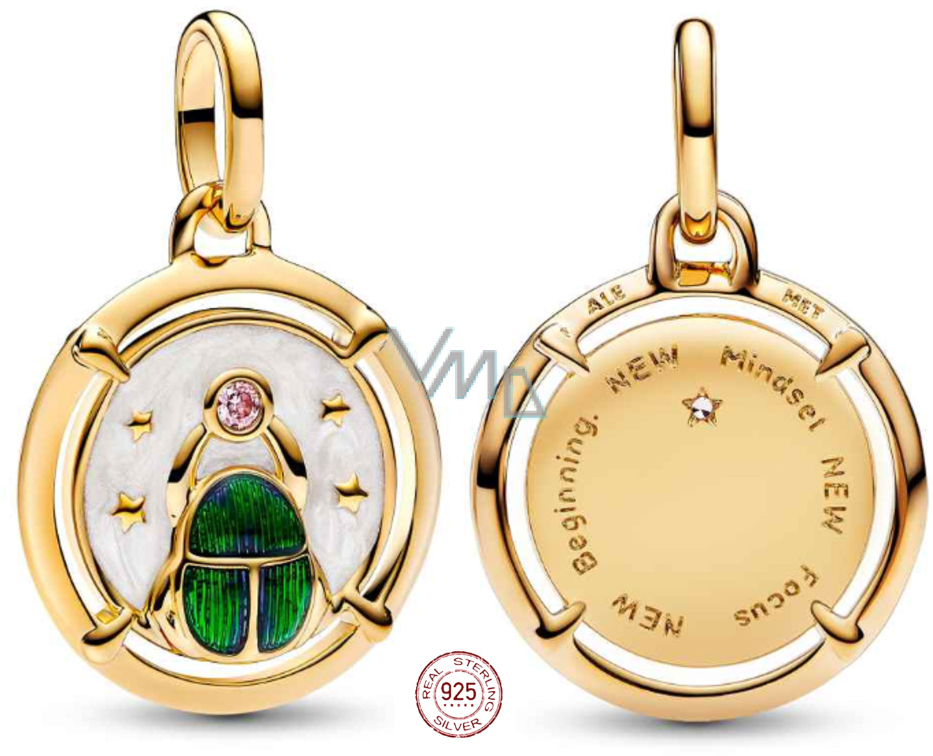 Resetujte svoje podvědomí pomocí tohoto smysluplného medailonového kouzla s motivem brouka Skarabea. Přívěsek je jemně pozlacený 14karátovým zlatem a obsahuje motiv brouka Skarabea s třpytivým zelenobílým smaltem - symbol růstu a transformace a růžovým krystalem z kubické zirkonie. Na zadní straně je vyrytý vzkaz „NEW Mindset NEW Focus NEW Beginning“ - „NOVÉ myšlení, NOVÉ zaměření, NOVÝ začátek“.