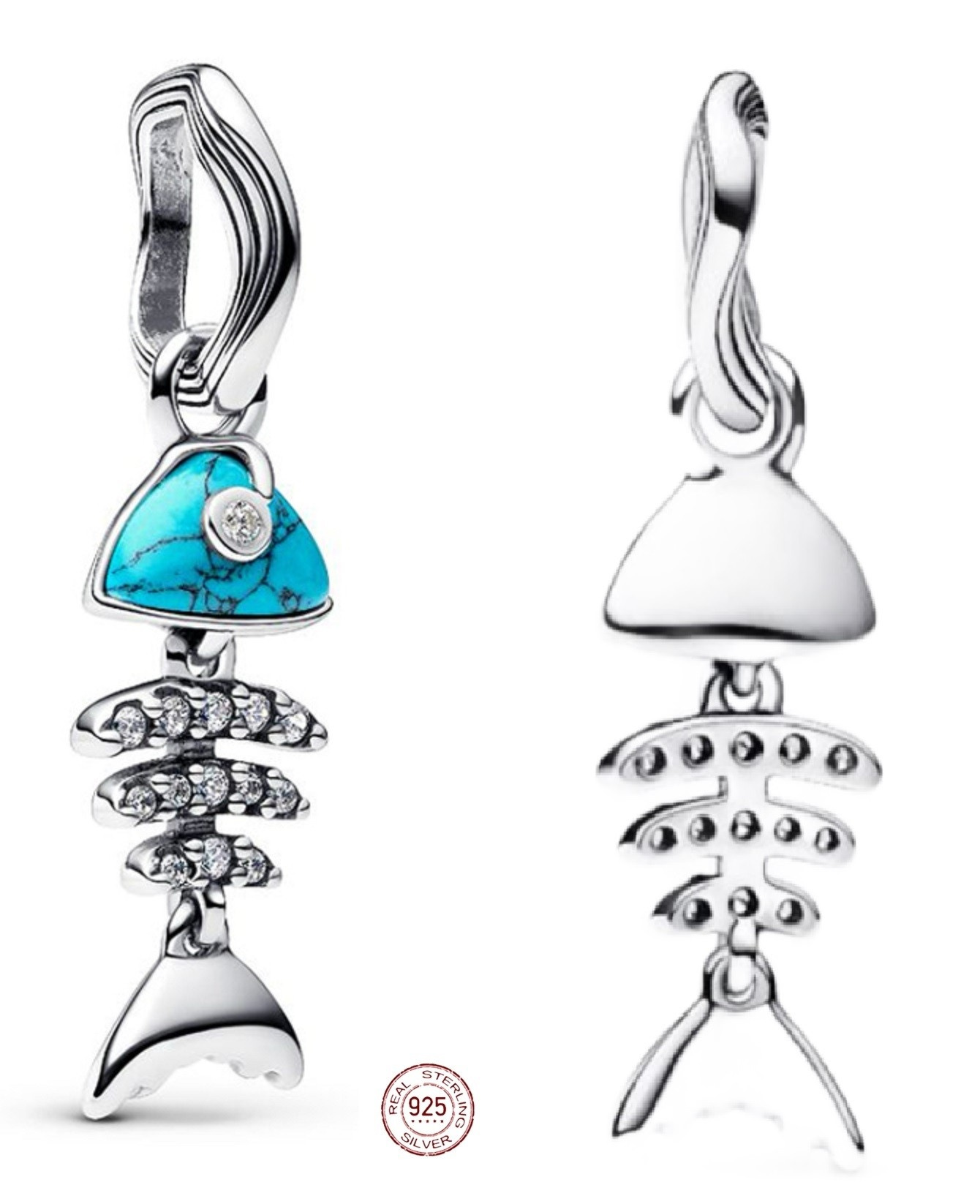 Charm Sterlingové stříbro 925 Mini medailon Tyrkysově zbarvený motiv rybí kosti, přívěsek na náramek zvíře