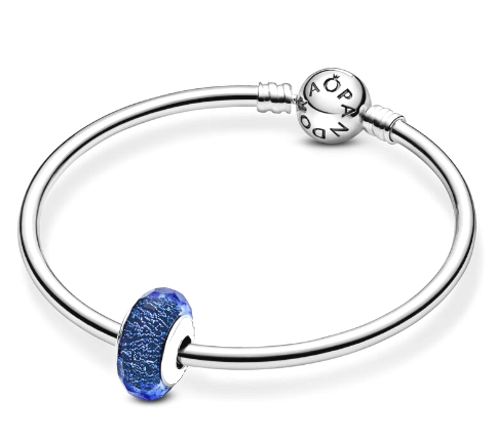 Duhový modrý skleněný přívěsek, který dodává náramku neodolatelné kouzlo Muránského skla. Přívěsek s povrchovou úpravou 925 Sterling Silver má exkluzivní design díky mnohotvárnému povrchu skla, který zachycuje a odráží světlo a září tisíci záblesky. Tančí se světlem a je oslnivý.