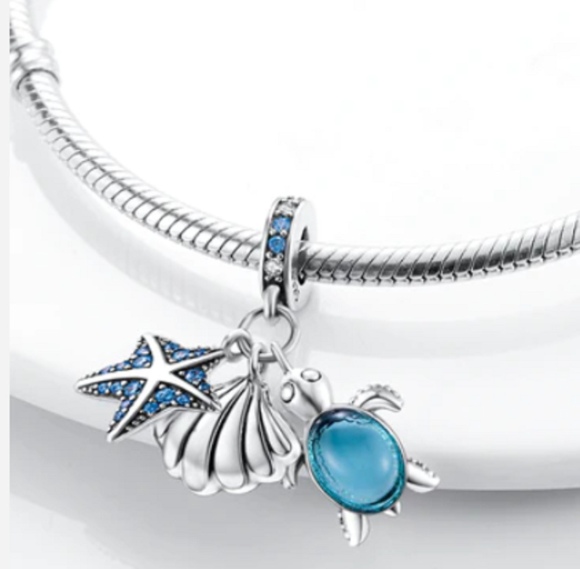 Charm Sterlingové stříbro 925 Mořská želva, hvězdice a mušle 3v1, přívěsek na náramek moře