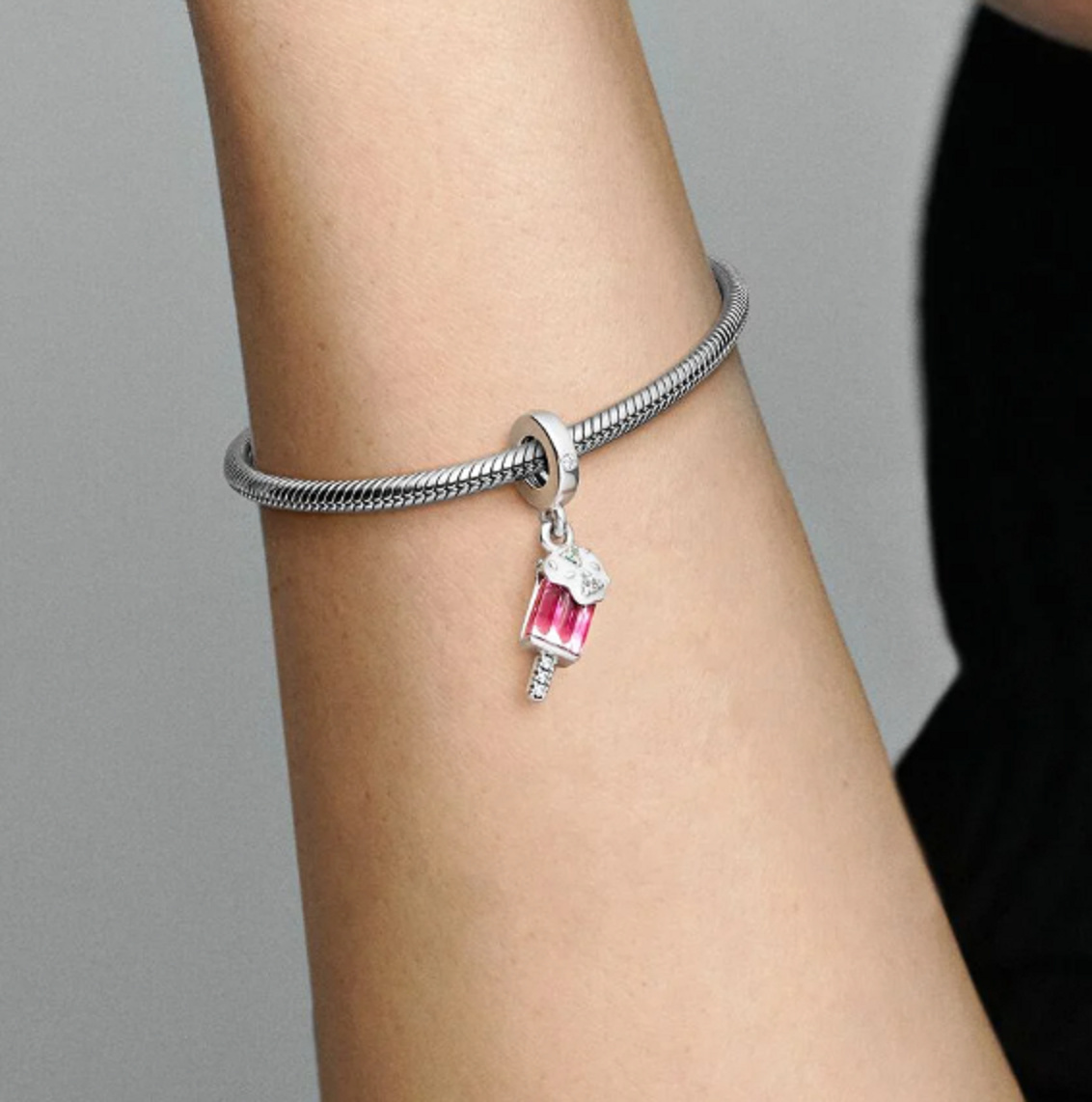 Přidejte si do své sbírky přívěsek ze sterlingového stříbra ve tvaru nanuku. Jeho skleněná část má realistické drážky a vrchní část je obalena kovem, který je potažen smaltovanou vrstvou, čímž připomíná roztékající se zmrzlinu. Dva vsazené Zirkony působí jako barevné bonbóny. Lesklá horní část je zdobena sklem, zatímco zadní stranu nanuku doplňuje gravírování zirkonie a hladké kovové detaily připomínající posyp. Inspirace: Pop Art & Candy World – hravé barvy a živý design inspirovaný světem sladkostí.