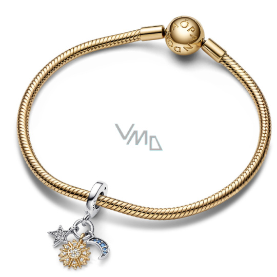 Vneste do svého šperku špetku nebeské magie pomocí dvoubarevného kouzla. Tento přívěsek kombinuje tři nebeské ikony: motiv slunce ve 14karátovém jemně pozlaceném zlatě s třpytivými kameny a mikrokuličkami, stříbrnou hvězdu s čirou dlažbou a stříbrný půlměsíc s temně modrými kameny.