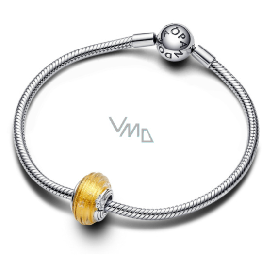 Tento třpytivý přívěsek je předurčen k tomu, aby se stal hvězdou vašeho náramku. Vyroben z rýhovaného průhledného skla Murano, je to jeden z nejjasnějších stříbrných přívěsků sváteční sezóny. Stříbrné jádro září ještě jasněji díky vrstvě 24k zlaté fólie. Se dvěma kameny kubické zirkonie zasazenými do tvaru padající Hvězdy v blízkosti jádra, toto kouzlo dodává druh třpytu, který je obvykle vyhrazen pro blikající Hvězdy na noční obloze.