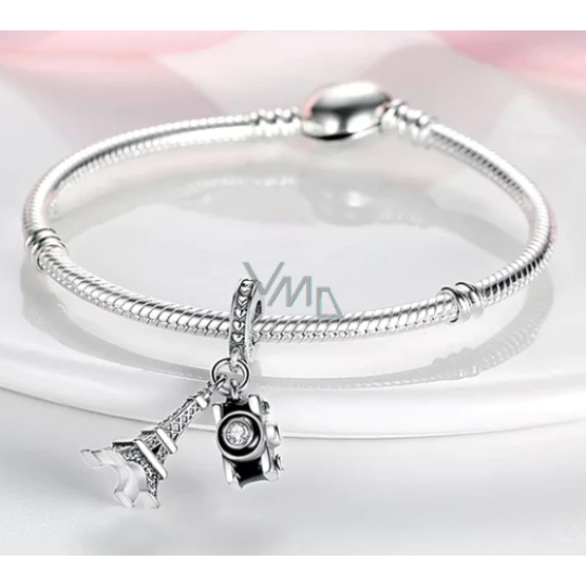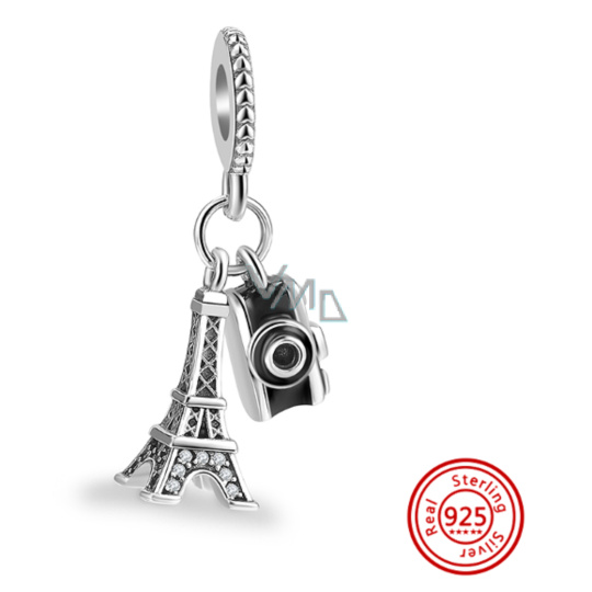 Charm Sterlingové stříbro 925 Paříž Eiffelova věž + fotoaparát, pozdrav z Francie, 2v1 přívěsek na náramek cestování