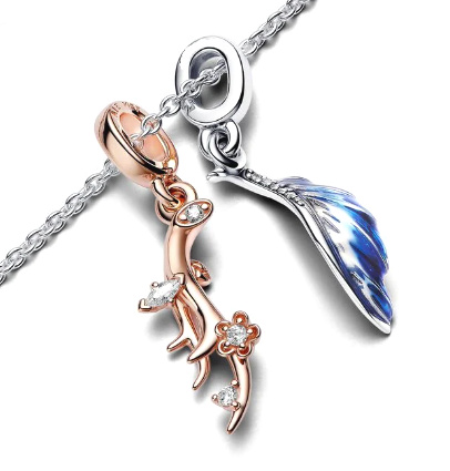 Propletený dvoubarevný přívěsek ve tvaru paroží a peří. Zakřivené parohy ze slitiny mědi a stříbra zahrnují hlavní tělo a menší větve s ostrými hranami. Horní část hlavního těla paroží je vykládaná kulatou syntetickou Kubickou Zirkonií, zdobená rýhovanými listy a Kubickou Zirkonií ve tvaru markýzy, s pětilistou květinovou soupravou s korálkovou Kubickou Zirkonií s každý okvětní lístek je lemován trojrozměrnými liniemi.